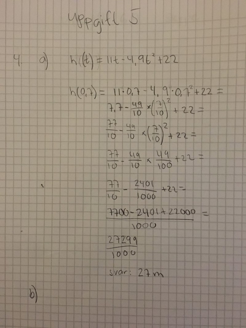 Vi börjar med a) Vi vet att funktionen beskriver kulans höjd efter t sekunder. Du vill alltså räkna ut h0,7.
