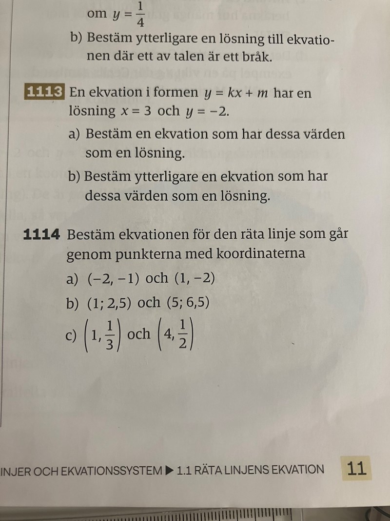 Uppgift 1114 har jag skrivit ner punkterna i ett koordinatsystem för att se hur den räta linjen skulle se ut. Samt så började jag försöka räkna ut riktnings koefficienten men måste gjort fel någonstans då jag fick det till 1/-3 när svaret skulle bli y = -x/3-5/3