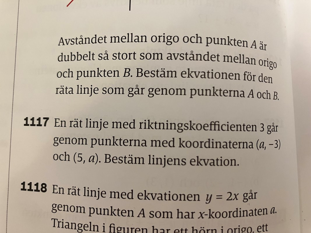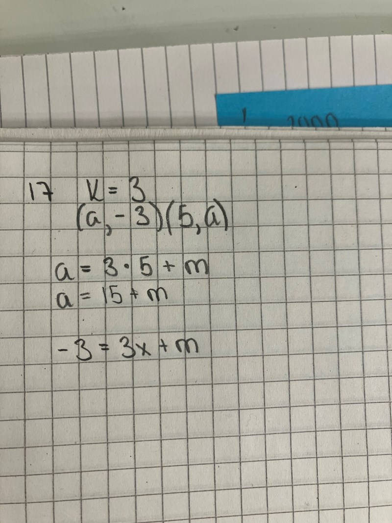 bestäm linjens ekvation om k=3 och går genom (a,-3) och (5,a)