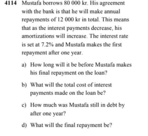 Skulden är 80000kr. Första året är räntan = 0,072*80000=5760. Skulden i slutet av året är då 85760 kr.