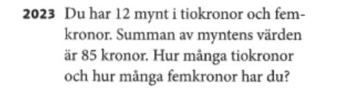 Svar: 5st tiokronor + 7st femkronor = 85kr