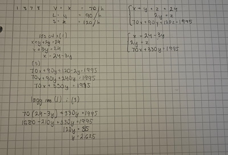 Jag har tänkt att y representerar lördag och fått fram fel svar. Rätt svar ska vara 7h, jag fick 2.625h. Kan någon snälla förklara var jag gjort fel eller ifall jag missat något!