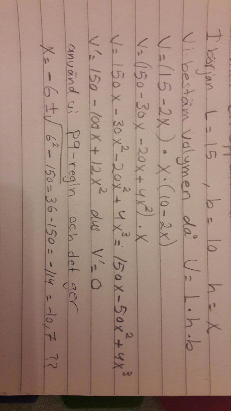 Jag tecknar en funktion som beskriver volymen av lådan , där min variabel x är ”uppviket”. (Dvs sidan på de småkvadrater jag sedan ska klippa bort)