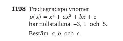 Eftersom du har alla tre rötterna vet du att p(x) = k(x+3)(x-1)(x-5). Multiplicera ihop och läs av a, b och c. Konstanten k får du fram genom att jämföra koefficienten framför kubiktermen.