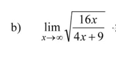 limx164+9x=164\displaystyle \lim_{x\to\infty}\sqrt{\frac{16}{4+\frac{9}{x}}}=\sqrt{\frac{16}{4}}