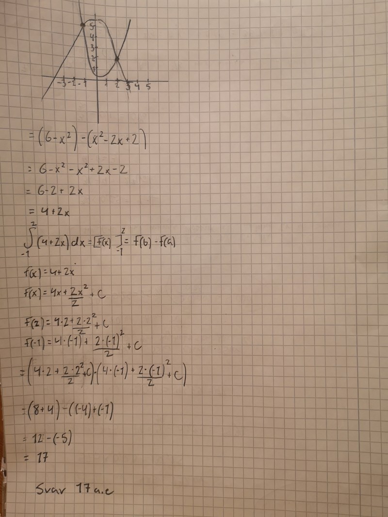 Jag upptäcker ett fel när subtraherar den övre ekvationen från den undre. Du har (6-x2) - (x2-2x+2), det blir (4-2x2+2x). Du tappade alltså -2x2 i dina beräkningar, men f ö ser det ut som om du gjort rätt.