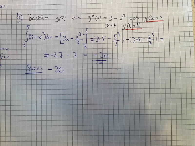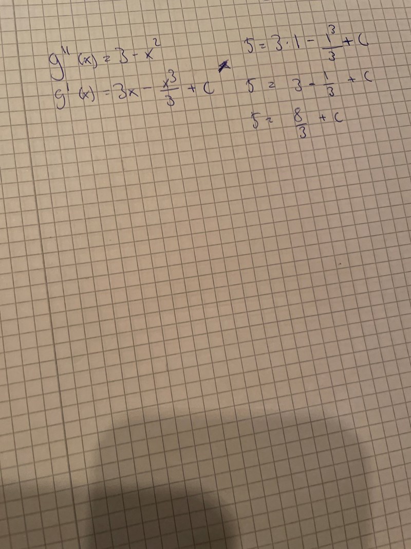 Själva uppgiften är ”Bestäm g(x) om g ’’ (x) = 3 – x^2 och g (3) = 2 samt g ’ (1) = 5. ”