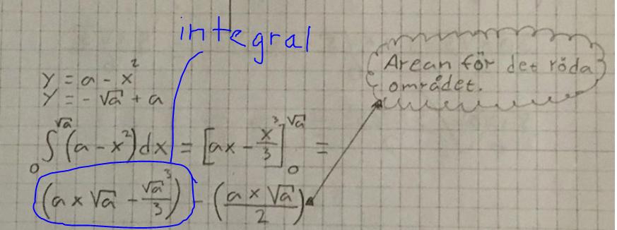Sten skrev:Jag tycker det blir svårt att följa uträkningen, när arean för röda området dyker upp i integralberäkningen.