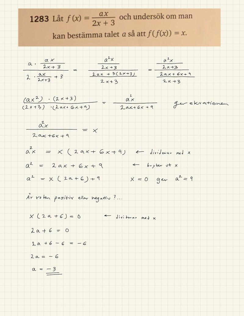 Ditt uttryck för f(f(x)) ser rätt ut. Du får ett värde på a genom att sätta x = 0, vilket är ok, för det ska gälla för alla x.