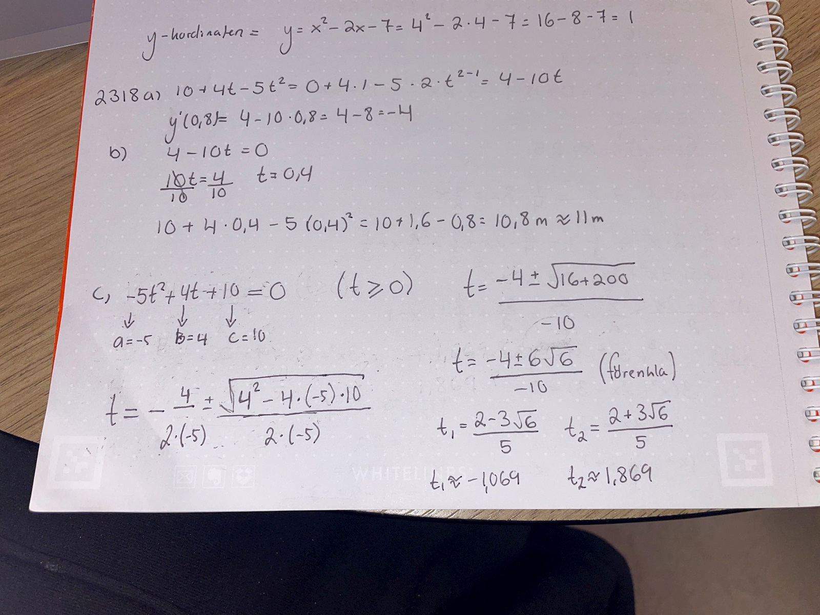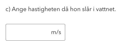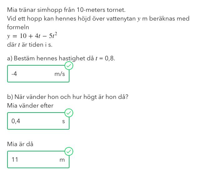Jag har hittills löst a) och b) utan problem. Det är c) som jag fastar på. Försökte göra abc lösningen för andragrads- och polynomgrads- funktioner men förstår inte riktigt vad som blir själva medelhastigheten. Är det de negativa värdet då hon faller?