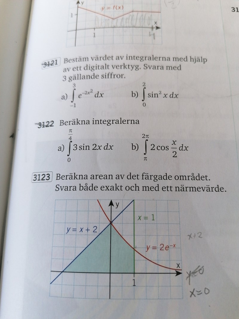Hej.Idag tar jag ställning till två frågeställningar. Den ena är vilken är den övre och undre funktionen? Hur gör man när det är svårt att se grafiskt? Den andra är när läggs funktionerna ihop, ex. när man ska hitta ett färgade område? Frågorna är relevanta, eftersom det hjälper till att lösa uppgiften.Under tiden försöker jag hitta information på nätet samt att vara aktiv i denna tråden.