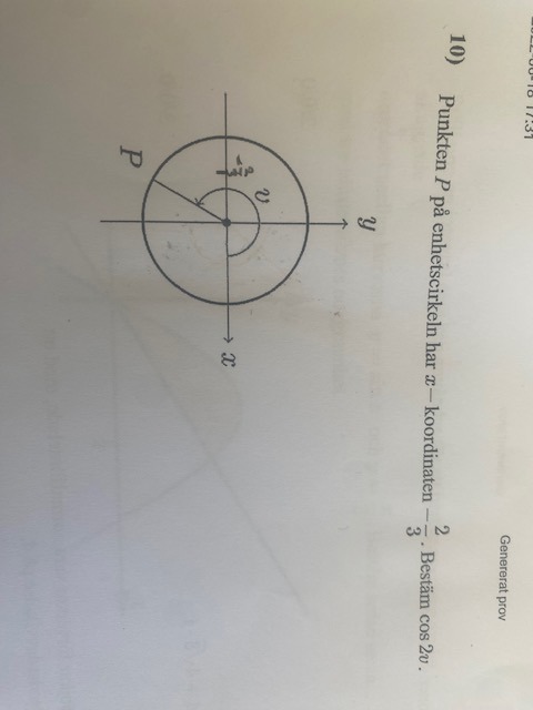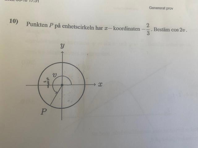 Formeln "cosinus för dubbla vinkeln" är precis vad du behöver. Du har ju värdet för cos(v), så använd den varianten där du inte behöver sinusvärdet.