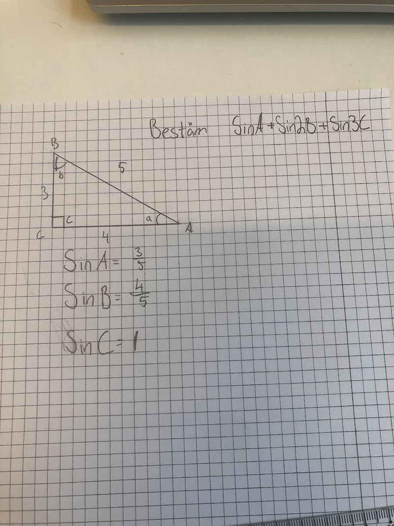 1174I den rätvinkliga triangeln ABC är a = 3, b = 4 och c = 5. Bestäm utan räknare värdet av uttrycket sin A + sin 2B + sin 3C.