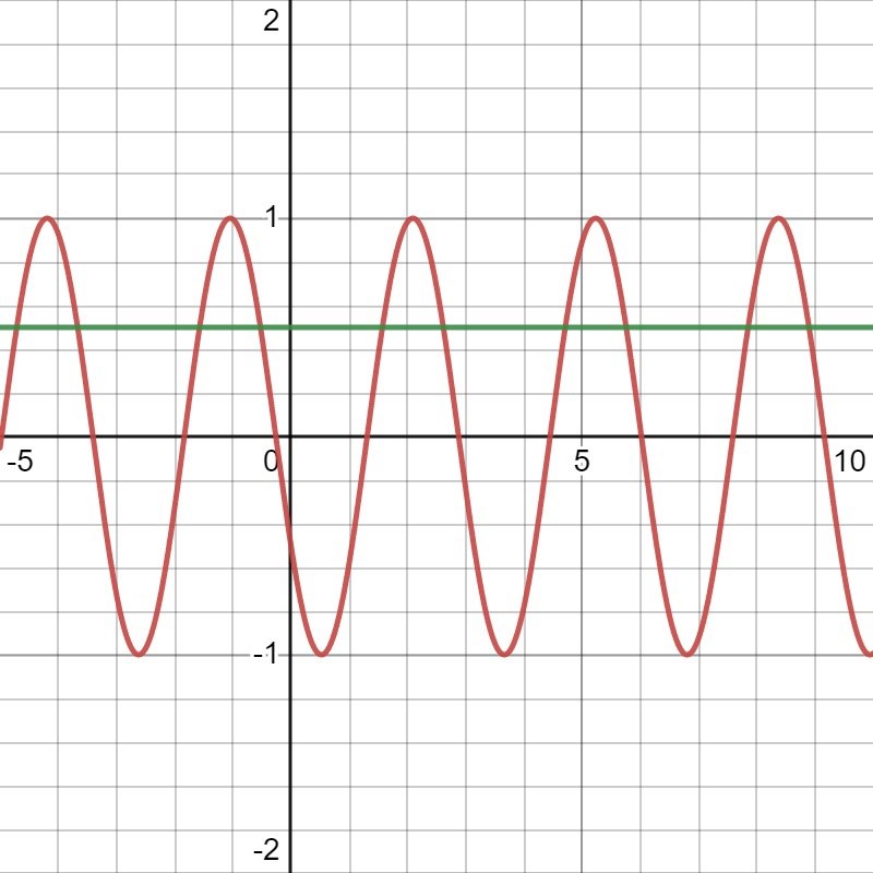 Javisst, det kan man också rita. Det kallas att lösa ekvationen grafiskt, och är bra för att det ger en ungefärlig bild av vad man försöker visa, i det här fallet att det finns många lösningar. Lösningarna är där den röda och den gröna kurvan korsar varandra.