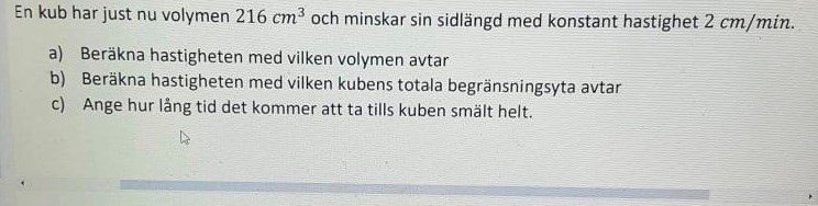 Notera att volymen V=V(t) och att kubens sida x=x(t).