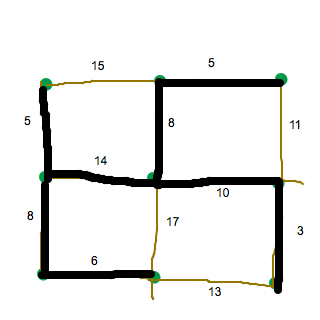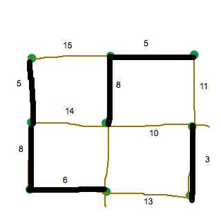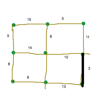 - Nej, jag menar 8-sträckan på precis motsatt sida, längst till höger. Att det blir en cykel innebär att då kan gå runt runt runt utan att lyfta pennan. Då är det inget träd. I algoritmen ingår att en måste undvika cykler till varje pris. I en cykel finns det två kopplingar till samma punkt; det är dyrt och bidrar inte med mer än en koppling skulle ha gjort.