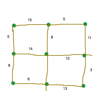 Nio hus ska kopplas samman med en fiberkabel. Hur ser den billigaste layouten ut? Vi börjar med den billigaste sträckan: