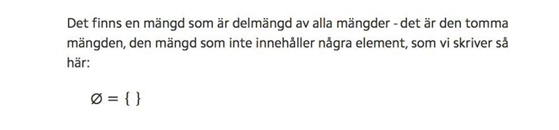 En liten detalj i sammanhanget, men är det inte så att tomma mängden betecknas eller , snarare än ? Om man skriver så har man beskrivit en mängd med ett enda element, där det enda elementet är den tomma mängden. Jag tror att det dessutom är potensmängden av den tomma mängden. Denna mängd har kardinalitet 1 (innehåller 1 element), och tomma mängden har kardinalitet 0 (innehåller inga element). men just för att HL där beskriver en mängd med ett element som är den tomma mängden, alltså .