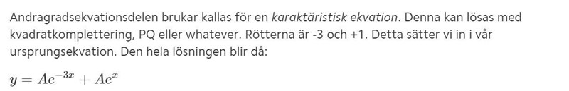 Andragradsekvationsdelen brukar kallas för en karaktäristisk ekvation. Denna kan lösas med kvadratkomplettering, PQ eller whatever. Rötterna är -3 och +1. Detta sätter vi in i vår ursprungsekvation. Den hela lösningen blir då: