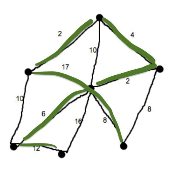 Uppspännande träd: Ett annat grafteoretiskt problem handlar om att hitta en koppling mellan alla ingående noder, utan upprepning. Detta kallas för ett uppspännande träd. Till skillnad från vägarna måste det inte vara möjligt att gå sträckan. Ett uppspännande träd kan se ut som nedan: