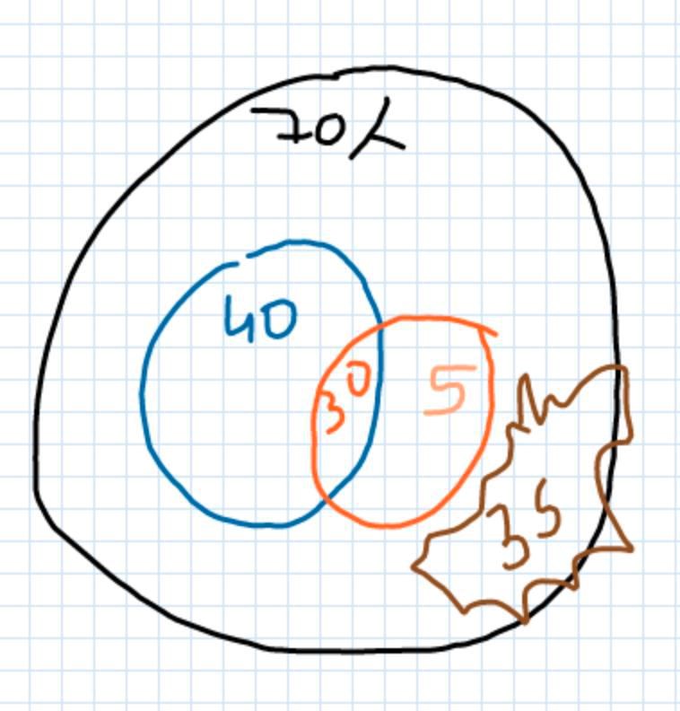 - 70 personer ska träffas för att åka på en resa. 40 personer har packat skidor, 35 personer har packat varm choklad. 30 personer har packat både skidor och choklad. Hur många personer har inte packat någonting?