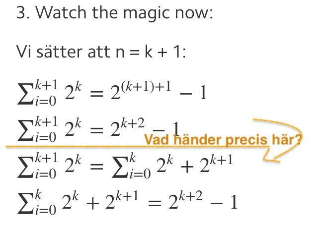 Men, vi vet ju att den vänstra termen i VL (med summaformeln) är lika med 2^(k+1)-1, enligt vårt antagande. Då kan addera det uttrycket till VL, och vi får: