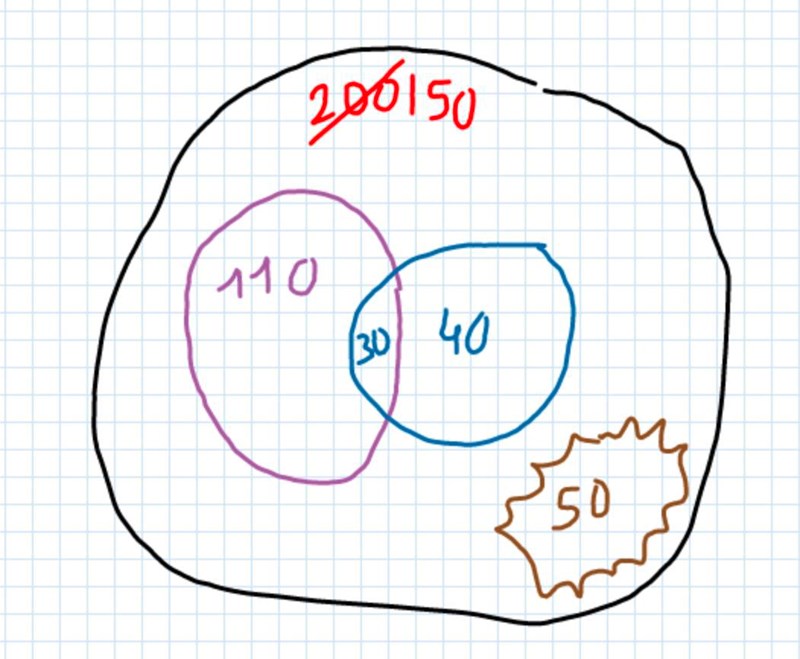 - 200 personer frågas om vilka djur de gillar. 110 pers. svarade hund, 70 personer svarade katt, och 50 personer svarade att de hatar djur och all glädje i hela universum. Hur många personer gillar bara katter? (Förutom Daja). Hur många personer gillar både katter och hundar?