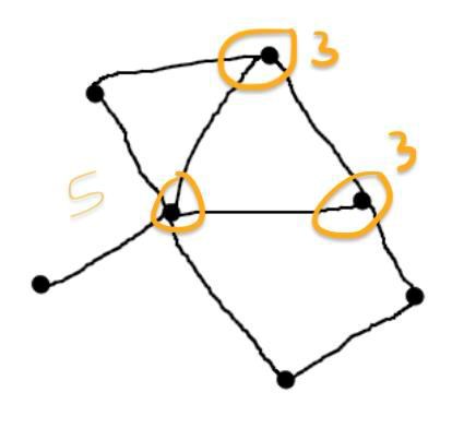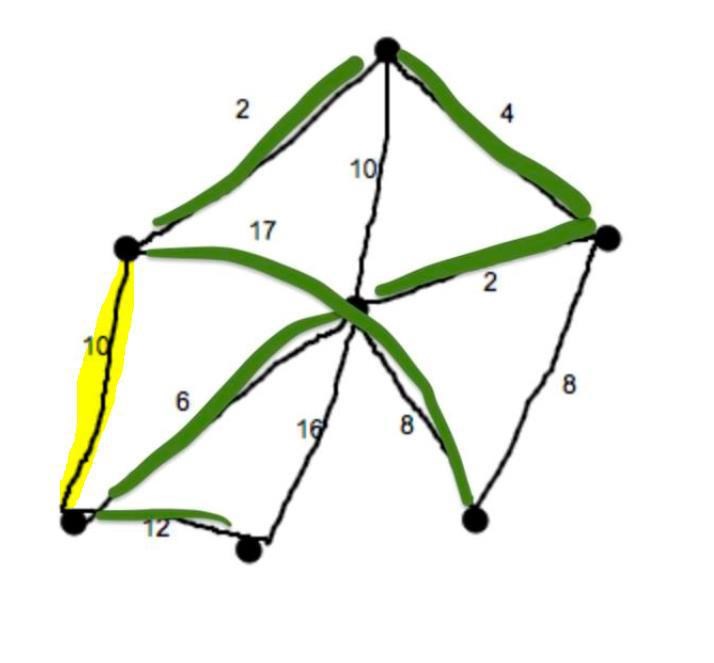 - Nej, jag menar 8-sträckan på precis motsatt sida, längst till höger. Att det blir en cykel innebär att då kan gå runt runt runt utan att lyfta pennan. Då är det inget träd. I algoritmen ingår att en måste undvika cykler till varje pris. I en cykel finns det två kopplingar till samma punkt; det är dyrt och bidrar inte med mer än en koppling skulle ha gjort.