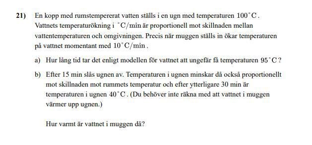 I uppgift a) har man valt att använda ugnens temperatur som "omgivningen", men vad rummets temperatur är, förvirrar mig. Är det ugnens temperatur innan denna minskning sker, eller är det något helt annat? Om jag utgår från att det är ugnens temperatur innan så är den 100 grader, vilket jag sedan tolkar att funktionen för ugnens temperatur borde vara något liknande: Z(t) = 100 - kt. (Z(0) = 100, alltså vid 15 minuter egentligen, kanske behöver göra om den ifall jag ser om det krockar)