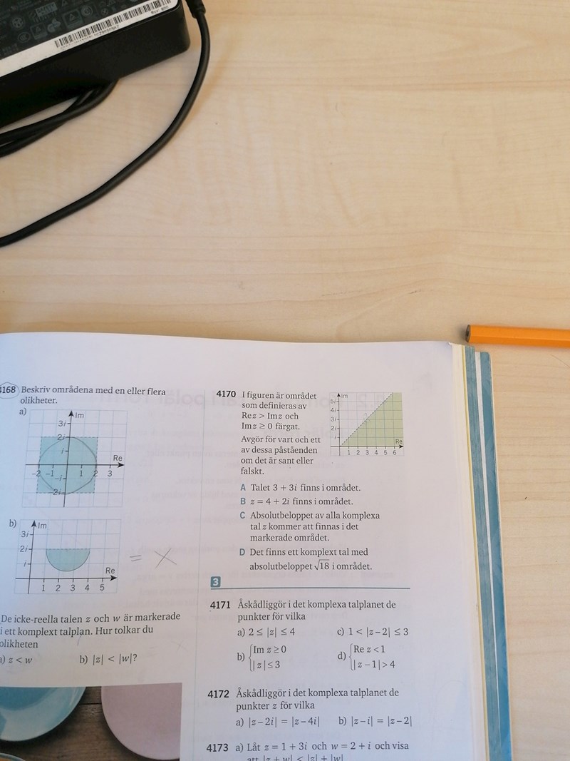 Tomten skrev:Absolutbeloppet = avståndet till origo. I det gröna området finns punkten A = 4+3i . Dess avstånd från origo är sqr(42 +32 )= sqr(25) > sqr(18). På linjen från origo till A måste det då finnas en punkt (ett komplext tal) på avståndet sqr(18).
