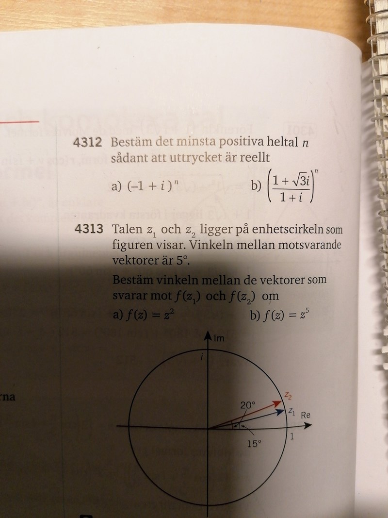 Skriv z1 och z2 på polär form och multiplicera ihop talen. Produkten har nu ett välkänt argument och du kan använda de Moivres formel för att ta reda på vad det minsta positiva heltalet n ska vara för att det resulterande komplexa talets argument ska vara ... ja vad ska det vara för att talet ska sakna imaginärdel?