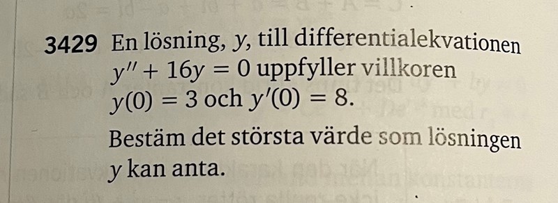 Hej! Jag har suttit ock klurat på den här uppgiften men kan inte komma på varför det största värdet som y kommer anta följer sambandet roten ur C2+D2. Det var inga problem att lösa differentialekvationen men om någon skulle vilja förklara ymax hade jag varit evigt tacksam!