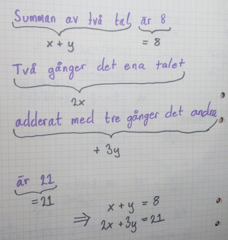 Visa hur du har försökt, så kan vi hjälpa dig vidare. Hur uttrycker du att summan av de båda talen är 8? Hur uttrycker du att två gånger det ena talet adderat med tre gånger det andra talet är 21?