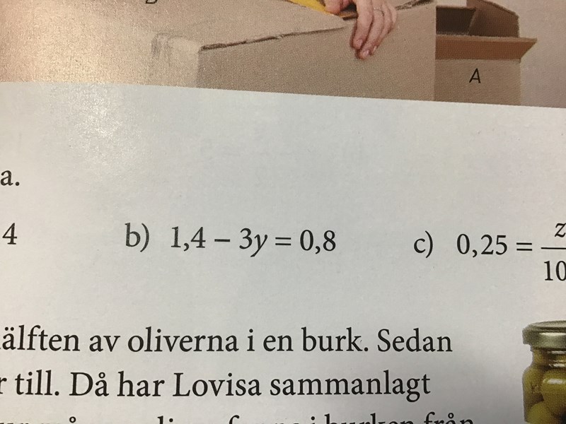 Det blir fel när du adderar 1,4 till båda led (rad två). Då får du kvar ekvationen 2,8-3y=2,22,8-3y=2,2. Subtrahera 1,4 istället, så får du -3y ensamt i vänsterledet. Du har nu ekvationen -3y=-0,6-3y=-0,6. Hur kan du gå vidare? :)