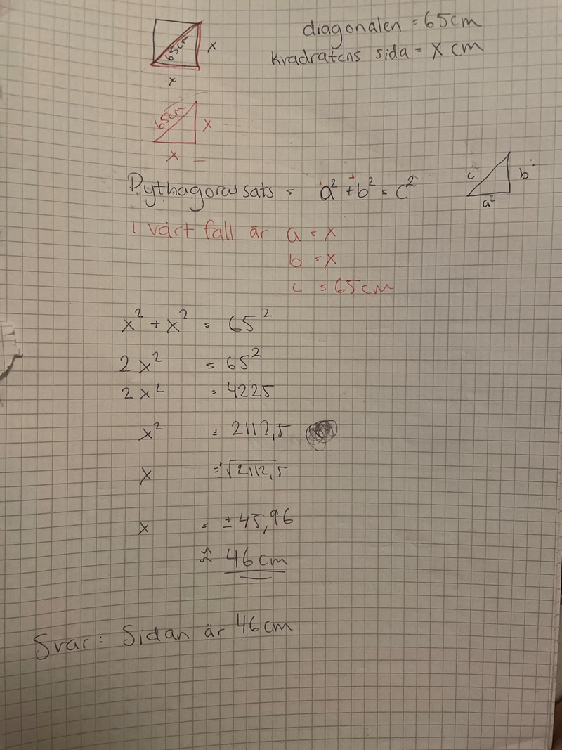 Om diagonalen är 65 cm vad blir sidorna