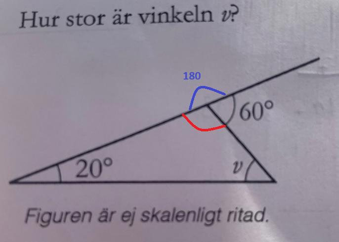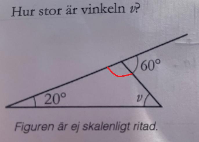 Nu fattar jag! 120 + 20 = 140. Vinkelsumman är alltid 180 i en triangel, därför är v=40 grader