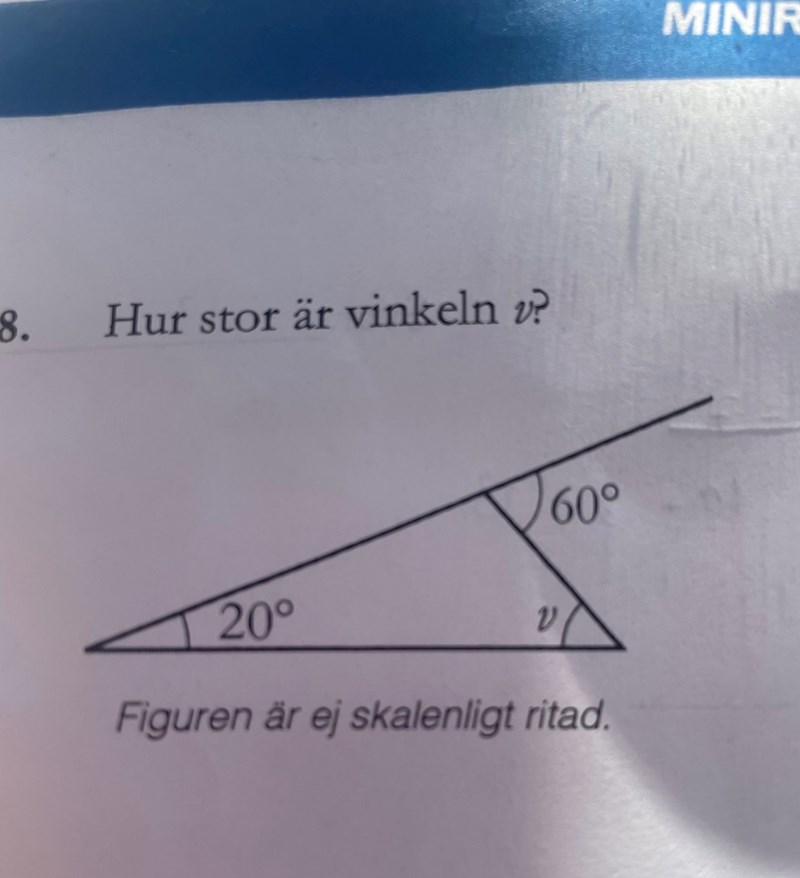 Du har en rät linje överst i bilden där man kan se 20 och 60 grader vinkeln. Vid en rak linje så är vinkeln 180 grader så vinkeln på andra sidan om 60 är 120 grader.