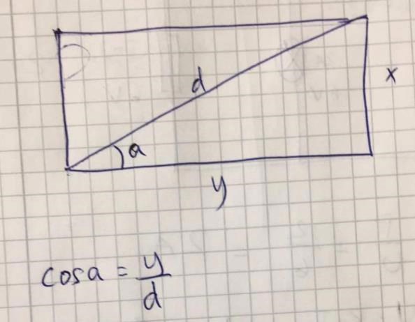 Jag kallar den långa sidan y. Så cos(a)=y/d vilket ger y=d*p