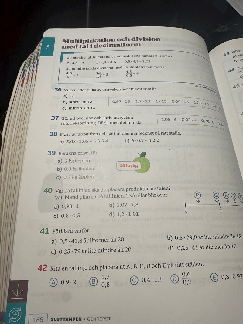 b) 1,02 * 1,8 kommer att bli ett tal som är lite större än 1,8 eftersom 1,02 som vi multiplicerar med är lite större än 1. Borde vara T även om jag inte ser hela tallinjen