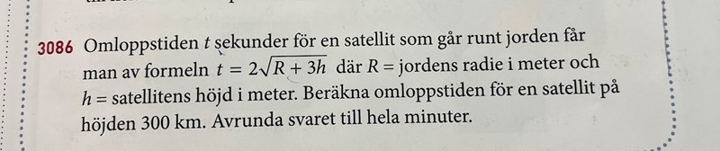 Troligen har du räknat ut 2√6370000+3x 300000 precis som det står, men rottecknet ska omfatta allt som kommer efter.