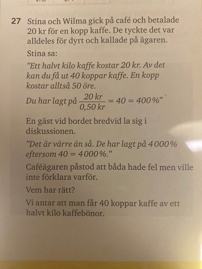 Jag har försökt lösa denna uppgiften litegrann men förstår inte. I facit står det att ingen har rätt eftersom 40 är förändringsfaktorn och ökningen är 3900%. Jag förstår inte hur man ska göra och har själv svårt med problemlösningar.