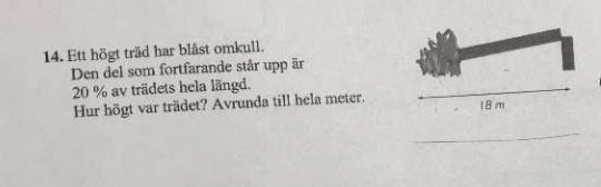 Det vi vet är att den lilla trädbiten som fortfarande står upp, som är en av "kateterna" i den rätvinkliga triangeln var 20 % av trädet. Trädet hade vi kallat för x. Då är trädstumpen 0,2x (20% av den).
