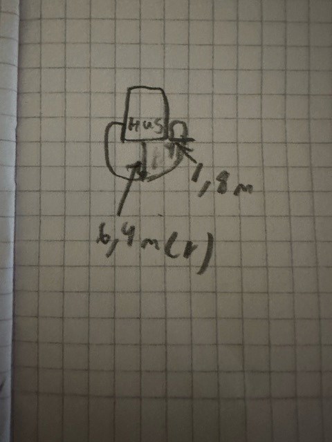 detta ritade jag 6,4m radie 2,8m bredd på hus och 1,8m långt ut geten kan nå(tror jag)