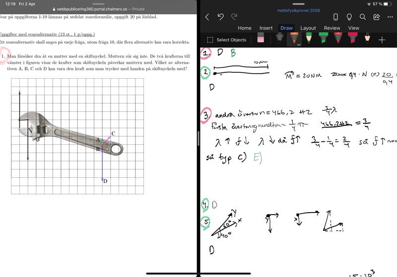 PATENTERAMERA skrev:Enligt Newtons tredje lag påverkar muttern skiftnyckeln med krafter som är lika stora men motriktade. Skiftnyckeln rör sig inte och således måste den resulterande kraften på skiftnyckeln vara noll - statisk jämvikt. Det betyder att den kraft som man trycker med måste vara lika stor som resultanten av de krafter skiftnyckeln påverkar muttern med, vilket verkar vara ungefär en halv ruta neråt.
