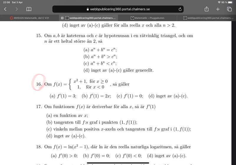 Jag svarade f’(1)=2x, det var fel. Varför blev det fel? Kanske har något med diskontinuitet att göra? Men förstår inte hur... det är ju inte x=0 vi tittar på, för x=1 är den ju kontinuerlig.