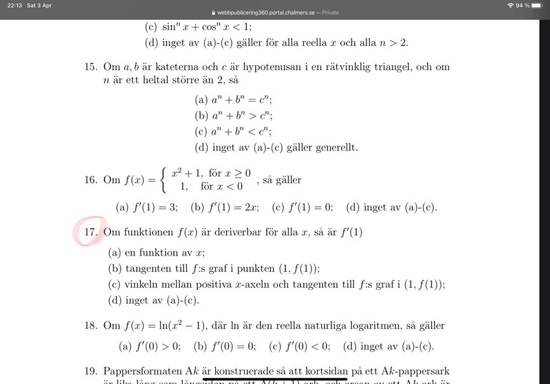 Hmm... f’(x) för godtyckligt x ger mig k-värdet för punkten x i f(x), alltså tangenten. I den punkten är y-värdet f(x), och x punkten är densamme för f’(x) och f(x). Hur kan svaret b) vara fel? Har fått något helt om bakfoten :P