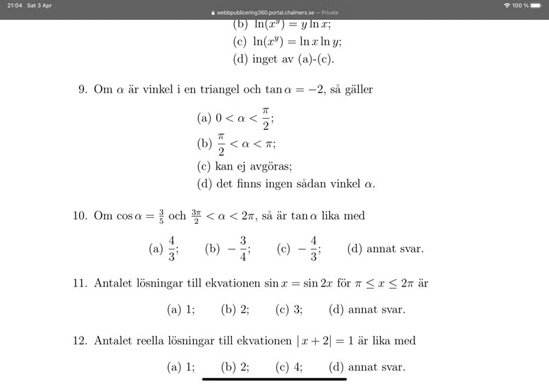 innebär att vinkeln är i andra eller fjärde kvadranten. Därför blir rätt svar c).