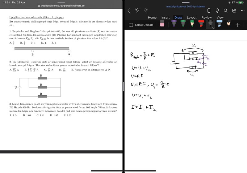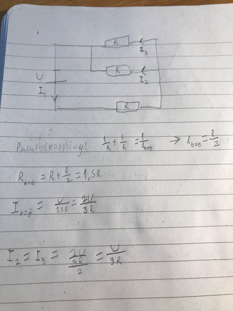 Huvudströmmen som kommer från batteriet delas upp i två strömmar I2 och I3. Eftersom resistansena i parallelkopplingen är lika, kommer båda strömmar vara lika stora. Alltså kommer dem vara totala strömmen dividerat med 2