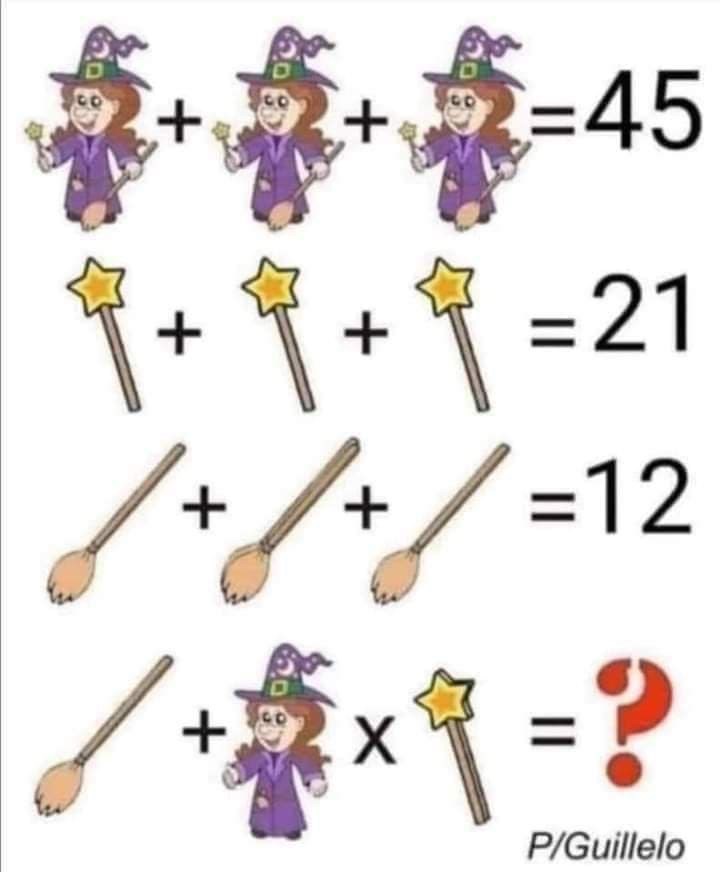 Hej! Nedan ser ni en bild delas på Facebook och man ombeds försöka lösa uppgiften. Man behöver titta väldigt noga på bilden för i mitten på rad två är det två kvastar som sitter ihop och på rad tre är det två stjärnstavar som sitter ihop. Enligt personen som skapat uppgiften är lösningen följande: