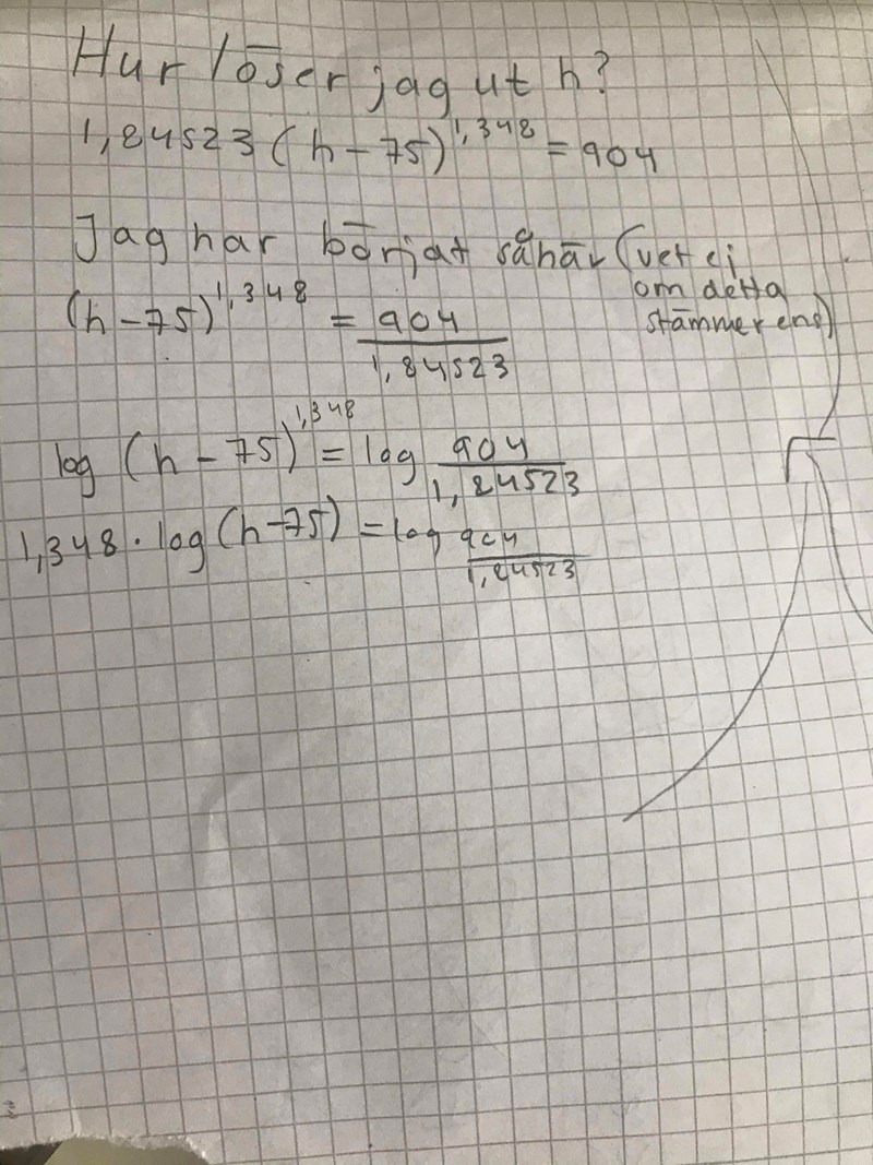 Okej men om du fortsätter härifrån: lg(h-75)=lg9041,845231,34810lg(h-75)=10lg9041,845231,348h-75=10lg9041,845231,348